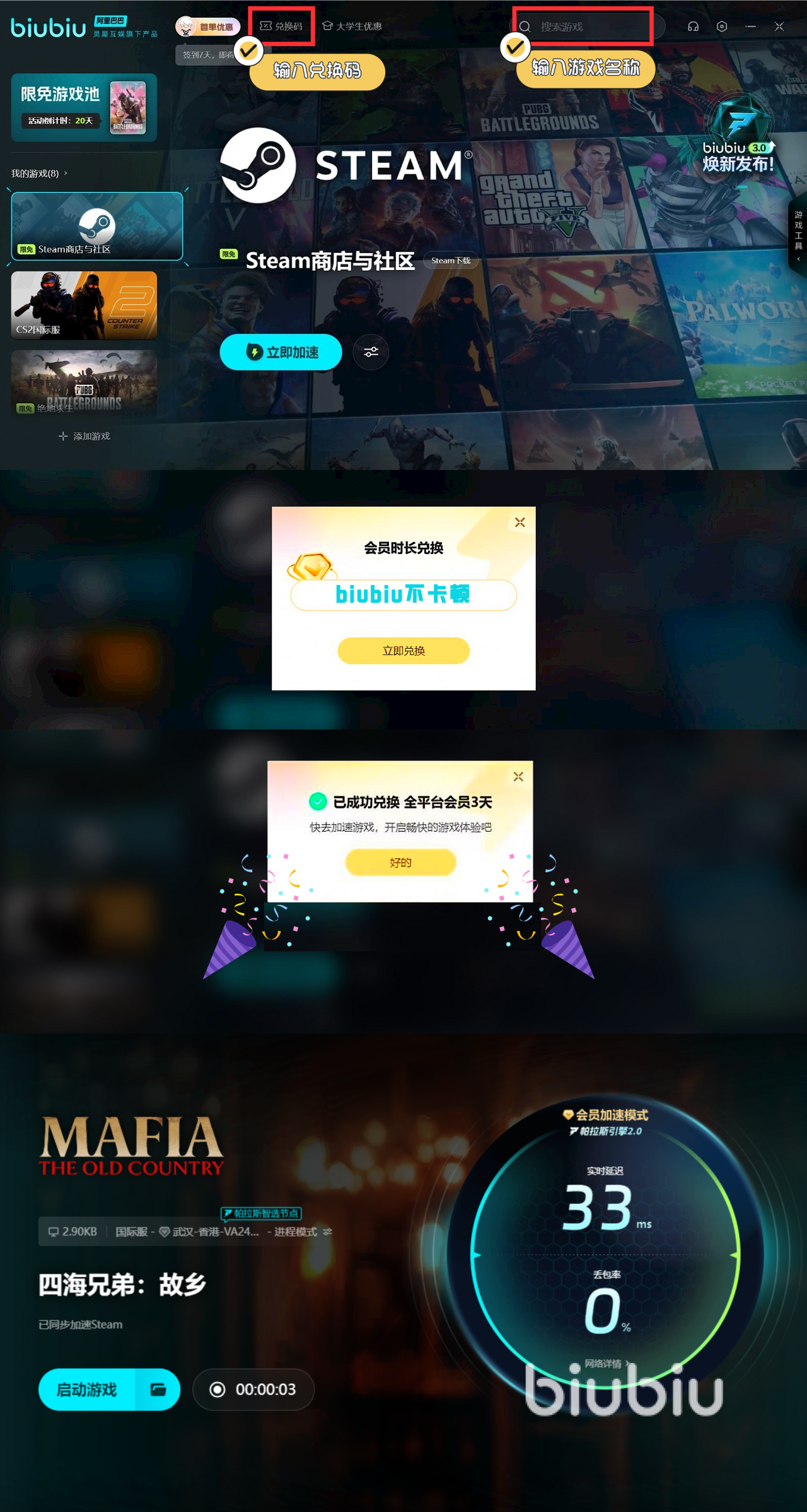使用者的福利是超级大的,新人注册之后立马就得到了免费的24小时加速时间的,然后继续用【biubiu不卡顿】还有额外的72小时服务时间获得,这个可是新老用户都能够领取的,新人也就是能够得到96小时加速时间了。