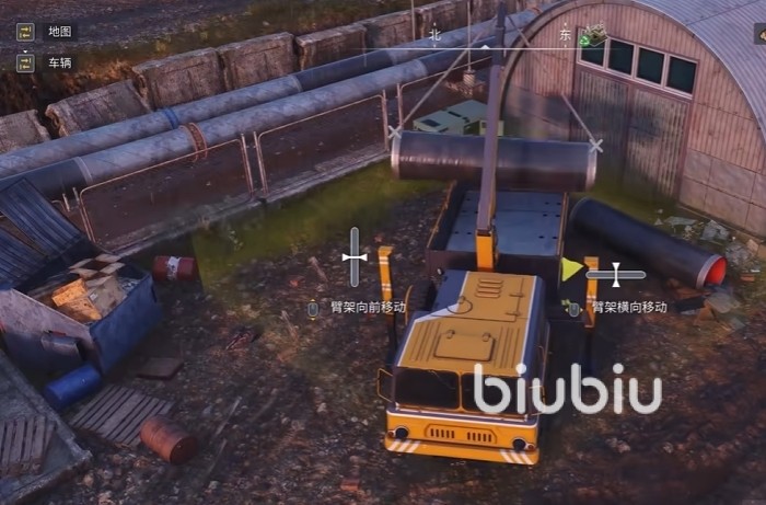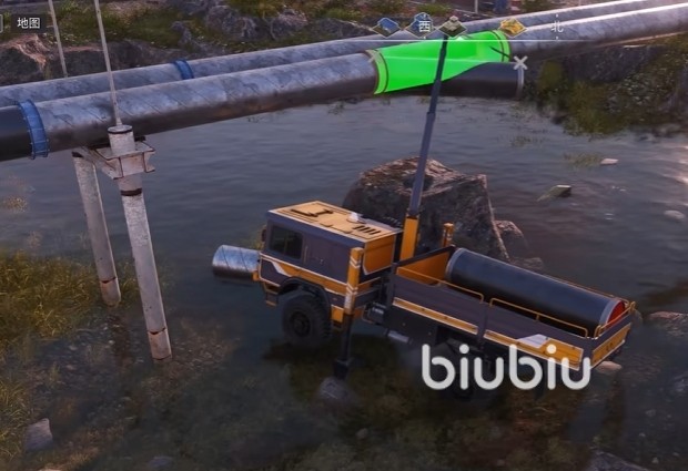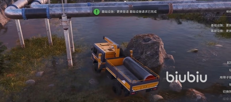 到达换管道的区域,大家会发现坏的管道会显示红色的标志,还是比较好找的。直接把坏的管道扯下来,然后操作起重机把好的管道吊起来挪到坏的管道原有位置,如果挪不到相应位置的话就挪一下车,然后再把管道往上挪,等管道位置的颜色变成绿色就代表可以了,直接松手就行。
