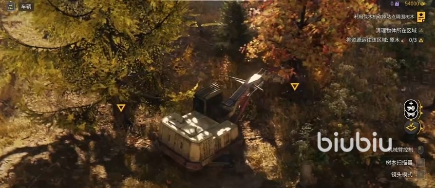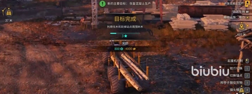 做修复电网任务的时候,大家可以跟随地图上的指示前进,到达任务地点之后,由于站点附近的树木比较多,所以大家需要把范围内的树用伐木机给清理掉,这里把木头弄掉之后放到拖车上跟着指示拉走就行,然后根据右边的任务指示将剩下的任务完成,将伐木机放回指定区域之后,就要开始接通电力了。