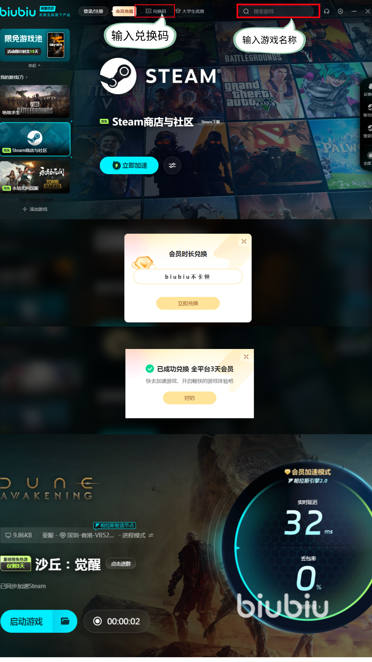 在玩儿的时候,如果要用加速器的话,上方给大家推荐的这款是比较好用的,还有超多福利,让小伙伴们可以免费加速,新用户登录注册会有24小时免费加速,使用兑换码biubiu不卡顿还可以兑换三天的体验时间,无论新老用户,每个小伙伴都可以兑换一次。