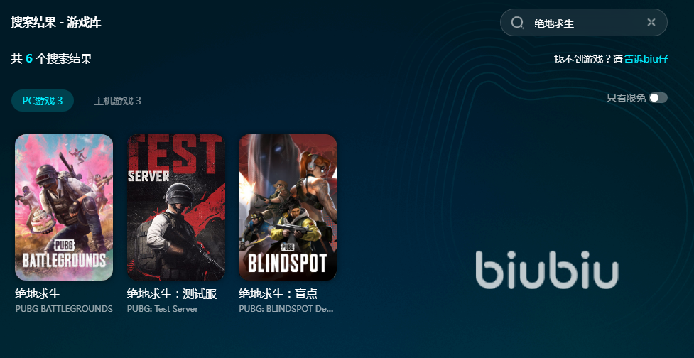 作为PeRo战队唯一合作加速器,biubiu当然有两把刷子的。它能够加速全球上万款游戏,光是绝地求生加速资源就高达6款,无论是玩主机端还是玩PC端都支持加速,对于其余想玩的游戏同样是搜索游戏名就能找到。