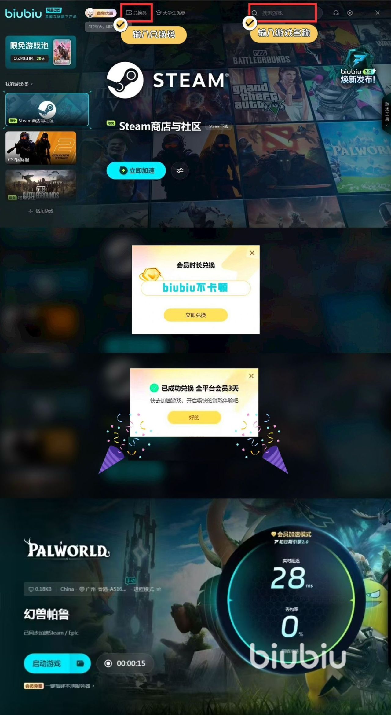 紧张刺激的游戏当中,很多的伙伴们都在为网络的干扰而头疼,有过屏幕前的你也有同样的状况,不妨试试小编所土所推荐的这款加速器吧,功能齐全操作简单便捷,并且在初次使用是可以领取到24h新人免费体验权限,【biubiu不卡顿】这个口令还能兑换到三天的优化时间。