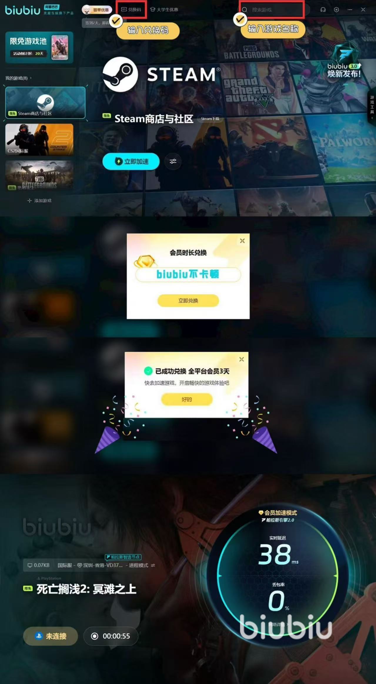 毕竟老用户都知道在steam平台想要顺畅的运行,专业的加速工具是必不可少的,市面上该领域同类作品琳琅满目,想要找到一款性价比高的优化工具并不是一键容易的事情。所以小编将这款软件分享给大家,操作简单便捷,同时也包含了各种不同类型的游戏作品,简直是游戏爱好者的天堂,此外还推出新人首次可以领取到24h免费权限,【biubiu不卡顿】兑换福利,正确输入可以拿到72小时会员身份。