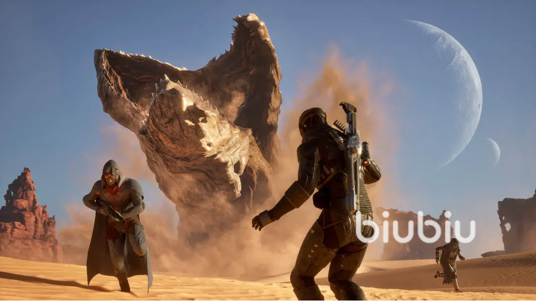 场景与环境方面完整呈现阿拉基斯星球辽阔沙漠景观,呈现了浩瀚沙海、标志性的沙虫突袭场景以及真实沙暴天气等,让玩家亲历沙虫掠过大地的震撼,感受足以改变地形的狂暴沙尘天气。
