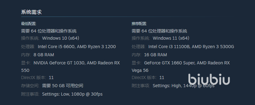 我们现在去steam上面其实就可以找到它了,在商品页下方就有相关的配置需求。官方给出来的最低配需要玩家有i5-6600的处理器,然后有1030的显卡就行了,这个要求还是比较低的。存储空间要大点,需要50gb。