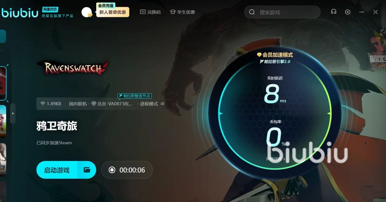 biubiu加速器的限免池定期更新,一键畅享加速,经过实测,鸦卫奇旅的丢包率几乎保持在0%,即便在后台运行,也能保证持续平稳、快速的加速效果。此外,还可以智能选择最佳服务器节点,无论身处何地,都能享受到优质的加速体验。