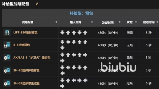 补给类指令当中有很好用的背包,B-1补给背包使用的还是频繁的,用↓←↓↑↑↓就可以用出来,次数是无线的,启动时间是5秒。还有SH-20防弹护盾背包跟SH-32防护罩生成包使用频率也高,按键分别是↓←↓↓↑←还有↓↑←→←→。
