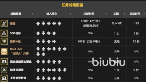 任务类的战令用的也挺多的,使用↑↓→←↑就可以召唤增援,要是想得到sos信标就可用↑↓→↑到。另外还有喜欢带地狱火炸弹的,需要使用↓↑←↓↑→↓↑来进行召唤。