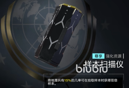 最后要介绍的时一个战备道具了,放在最后是有原因的,叫做样本扫描仪,它的效果是让我们在拾取样本的时候有几率获取双倍的样本物资。几率只有15%,在初期的时候有一点点用,稍微有装备之后,大家掌握了刷本的技巧,基本上就无用了,带着还占格子,大概率是放在仓库里面吃灰了。