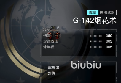 然后还有投掷武器在里面哦,是G-142烟花术,在具有伤害效果的同时还好看,很像小时候会放的烟花爆竹。使用之后可以爆炸然后产生燃烧效果,有点像燃烧弹,它用来攻击充足巢穴或者是小型建筑物,伤害效果还是挺不错的。
