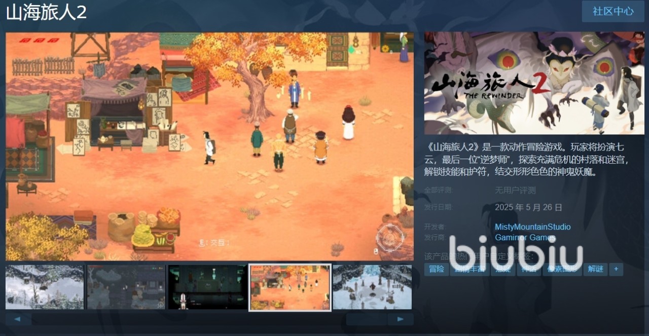 在steam上游戏的名称依然是山海旅人2,直接搜索即可,英文名字是The Rewinder 2,将于2025年5月26日发售,定价为62元,并在发布后的前两周内享受90折优惠。保留了前作的经典要素,还在故事情节、画面表现和玩法方面进行了提升,从而为玩家提供更加丰富的游戏体验。