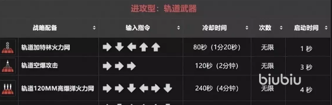 轨道武器杀伤力较强,可以用→↓←↑↑召唤出来加特林火力网打击敌人,要是三个→键就可以召唤出来轨道空爆攻击,轨道120MM的高爆弹火力网可以用→→↓←→↓召唤出来哦。