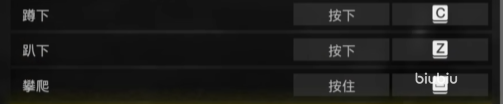 按键指令中,可以使用c键实现蹲下的动作,趴下则是需要按Z,而空格可以帮助我们攀爬建筑物,↑这个按键能让我们进入冲刺状态,需要躲闪攻击则需要用alt键。