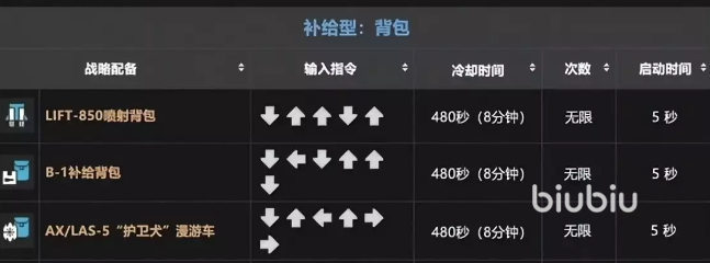 战备指令中不少都是好用的,不过更难,需要组合按键,速度一定要快。使用↓←↓↑↑↓就可以召唤出超好用的B-1补给背包,大多数副本都适用。护卫犬漫游车也是好用的辅助设备,用↓↑←↑→→连续按键召唤出来。