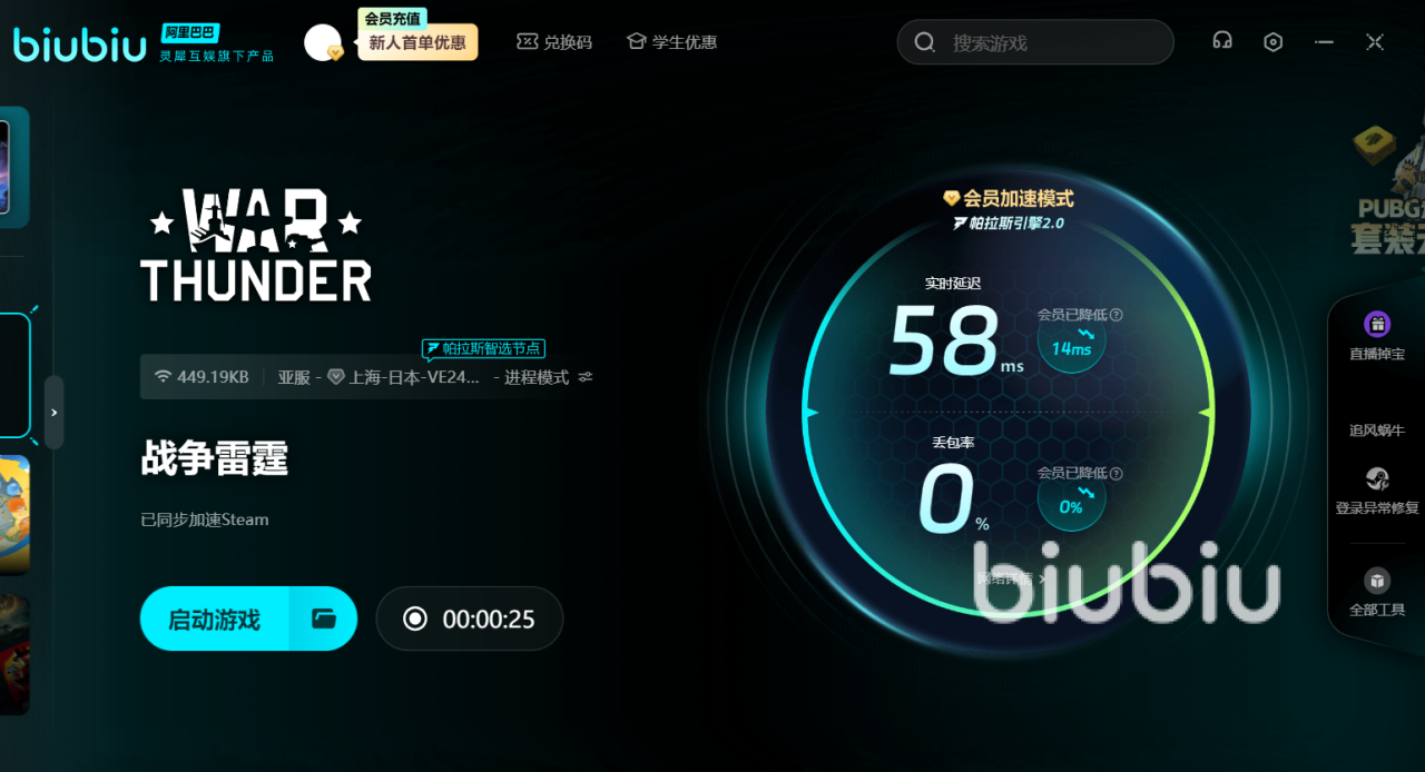 那就是需要用到biubiu加速器了。它堪称是跨国联机的“网络救星”。由于《战争雷霆》国际服汇聚了全球玩家,因此跨国网络延迟成了战斗中的“隐形敌人”。当你与队友正驾驶坦克集群推进时,网络卡顿可能导致你们的炮弹完全不同步,轻则打偏目标,重则被敌方反杀。biubiu拥有智能节点加速技术,能够显著降低延迟,确保你的每一次操作都能精准传达,避免因网络波动导致的战斗失败。