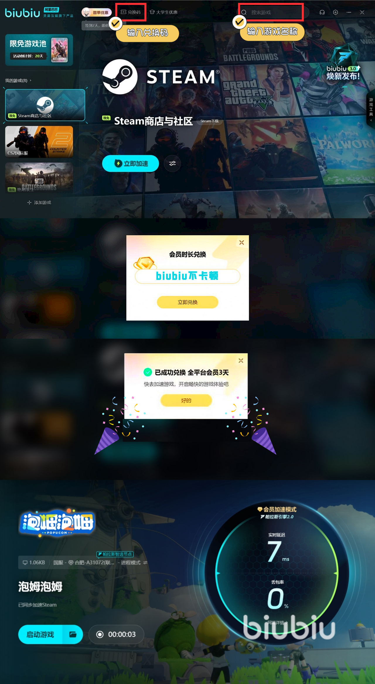 如果大家想要去成功解锁更多加速福利,那么还可主动来点击界面之中兑换,然后去借助【biubiu不卡顿】,那么所有平台注册的小伙伴均可顺利领取到72h加速,助力长时间体验,而不用再担心这个过程中会遇到卡顿等方面带来的影响。