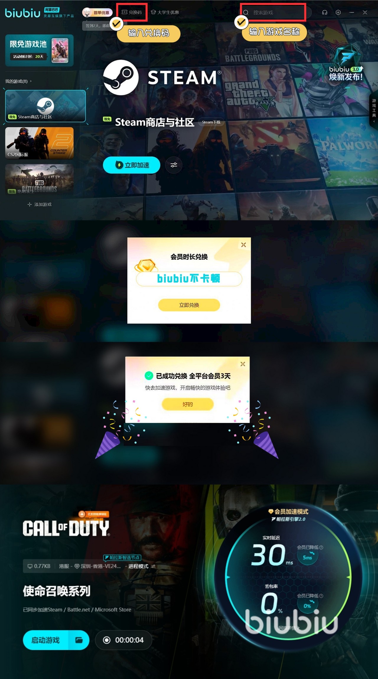 到时新用户首次登录能领取到24小时加速,所有平台用户均可主动点击兑换,输入【biubiu不卡顿】,到时所有平台用户均可成功领取到72小时加速时长。