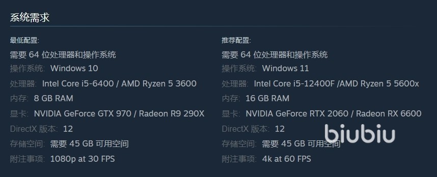 最低配置需要Windows 10,并且必须是64位版本,处理器英特尔 Core i5-6400或AMD Ryzen 5 3600,内存为8GB,显卡英伟达GeForce GTX 970在1080p分辨率下以30帧的流畅度运行游戏,存储需求为45GB,建议使用固态硬盘(SSD)以提高加载速度。
