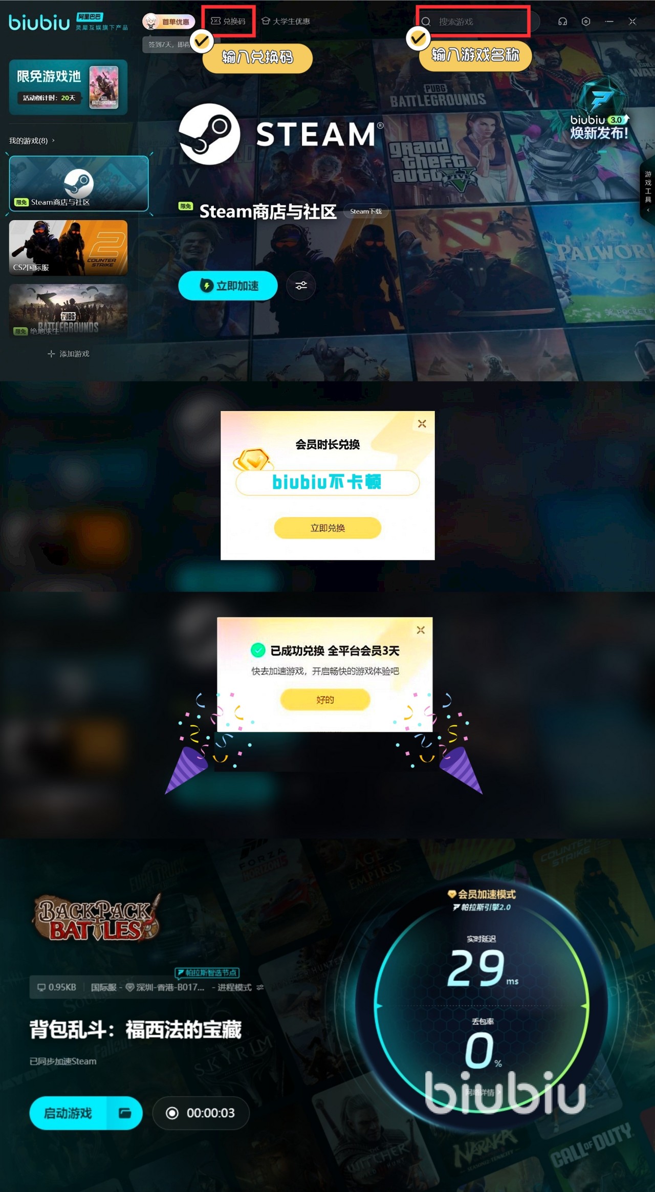 如果玩家到时希望能去解锁更多加速福利,还可主动点击兑换,然后借助【biubiu不卡顿】来帮自己,这样所有平台用户均可顺利领取到72小时加速福利哦。