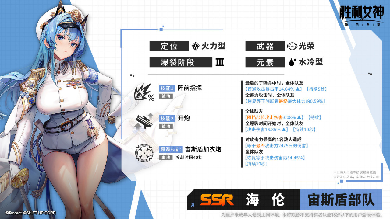 最后讲一下这个UP的抽取建议,如果预算充足的话海伦一定要抽,会战/突袭都未来可期。当然如果资源有限,常驻等歪那她非人权卡,T1够用。桑迪的话是必练的(PVE/PVP双T0,保质期极长)。本次国服还新增了海伦皮肤「指挥官の怠惰」,外观党可入。