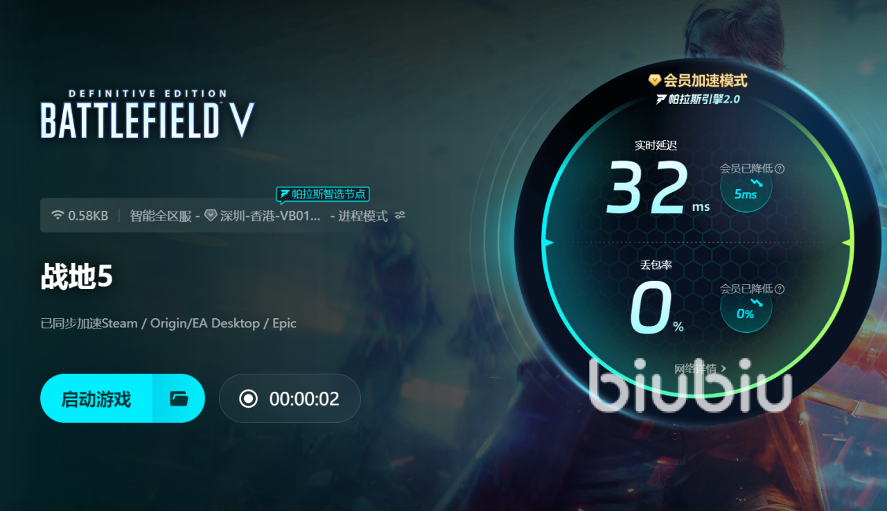 在主界面搜索《战地5》,点击“立即加速”,biubiu会结合当前网络状况、服务器稳定性、节点距离和质量,自动挑选最优路线。启动加速后,用户可随时查看网络状态,保障游戏流畅运行。无论新手还是资深玩家,都能轻松上手,享受畅快体验。借助会员加速模式,还能全面提升多款游戏的网络表现,尽情体验高速优化带来的畅爽感受。