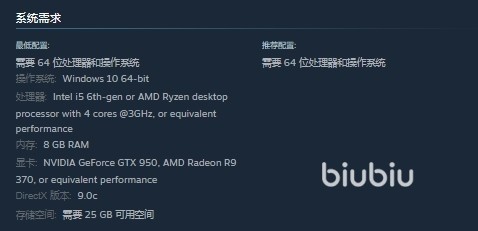 最低Windows 10,处理器i5或AMD Ryzen,主频3GHz或更高。内存8GB RAM,显卡NVIDIA GeForce GTX 950,支持DirectX 9.0c,存储空间25GB。
