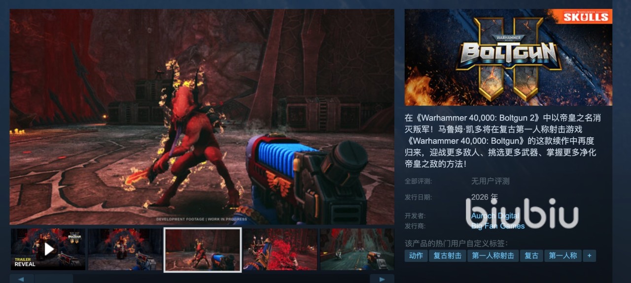 该作在steam平台上的正式名称已敲定为“Warhammer 40,000: Boltgun 2”。目前,该游戏的页面已正式上线并开放访问,玩家可通过页面了解游戏相关信息。同时,官方透露预计将于2026年发行,这一消息引发了众多玩家的关注。