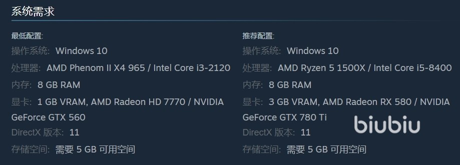 最低需要Windows 10的支持,处理器AMD速龙II X4 965或英特尔酷睿i3-2120即可,内存8GB RAM,显卡1GB,支持英伟达 GeForce GTX 560。此外,一般情况下,DirectX版本为11,存储空间只需有5GB可用即可。