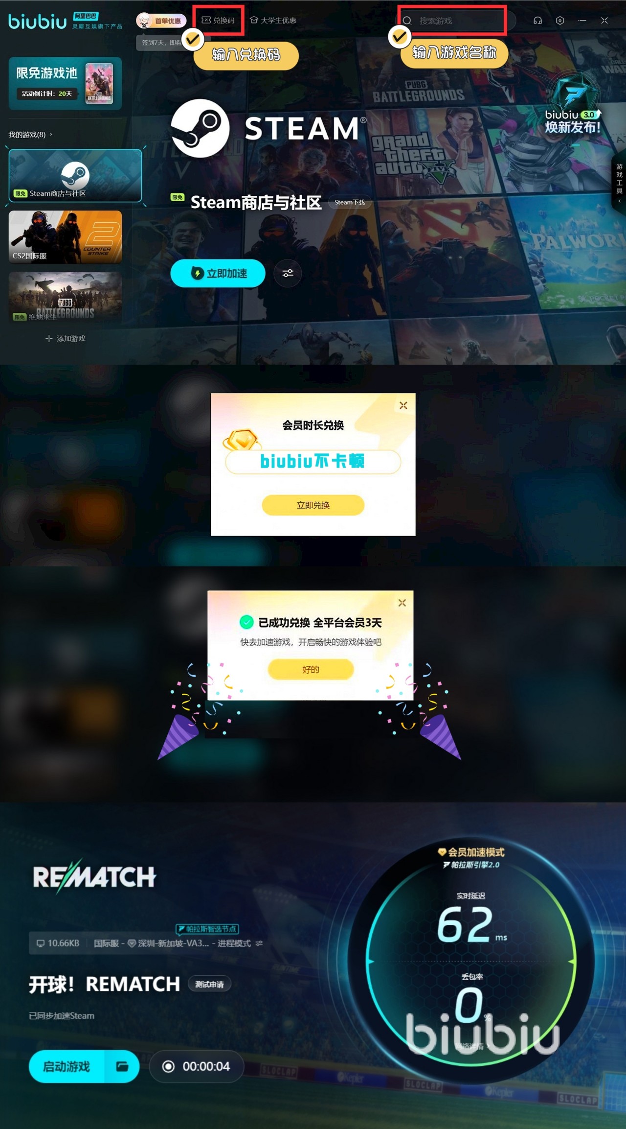 若各位希望成功解锁更多加速时长,可通过点击兑换功能,并借助【biubiu不卡顿】,所有平台用户均可顺利领取72小时免费加速时长。