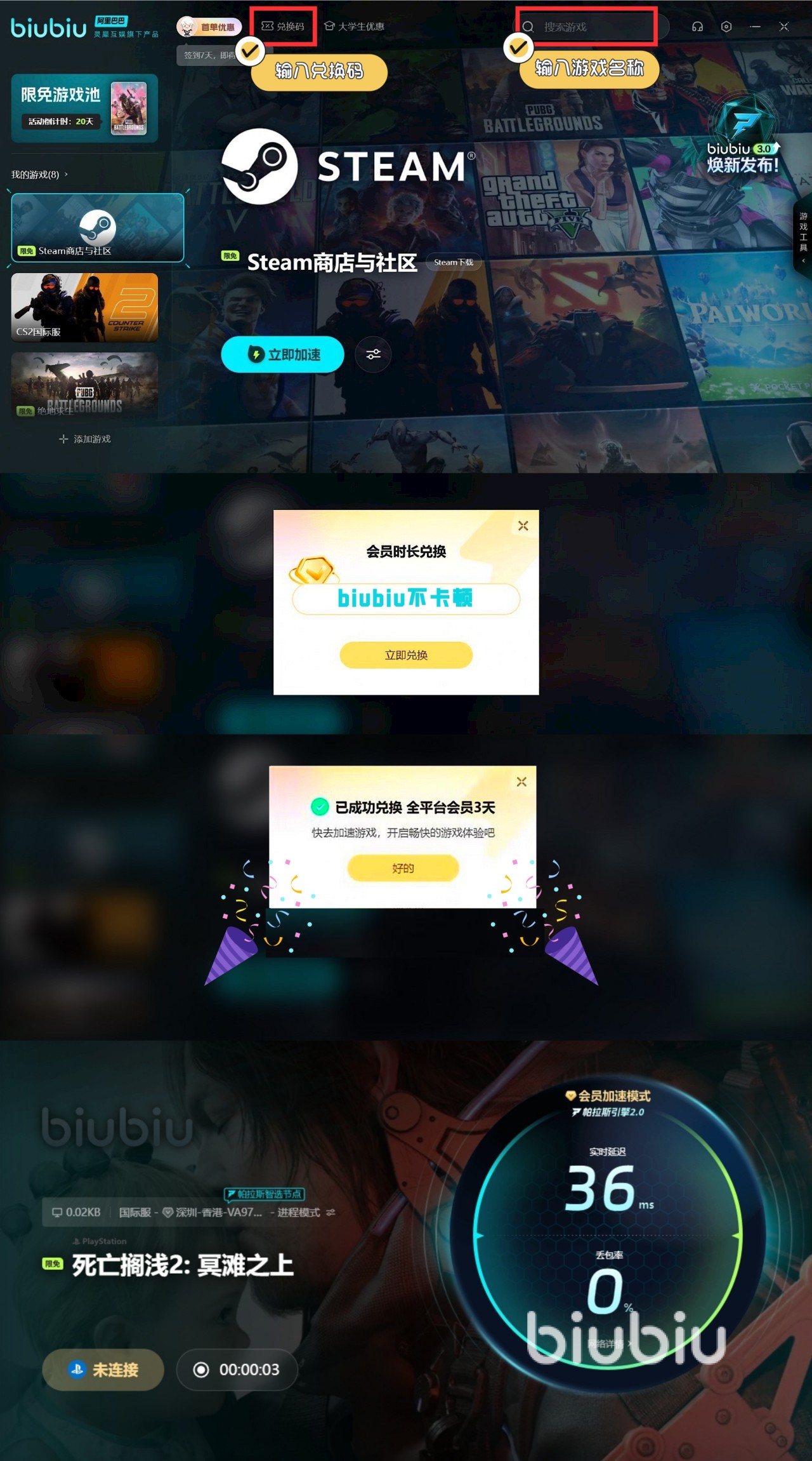 若玩家希望解锁更多加速时长,可主动点击兑换按钮,并通过【biubiu不卡顿】来领取72小时免费加速时长。