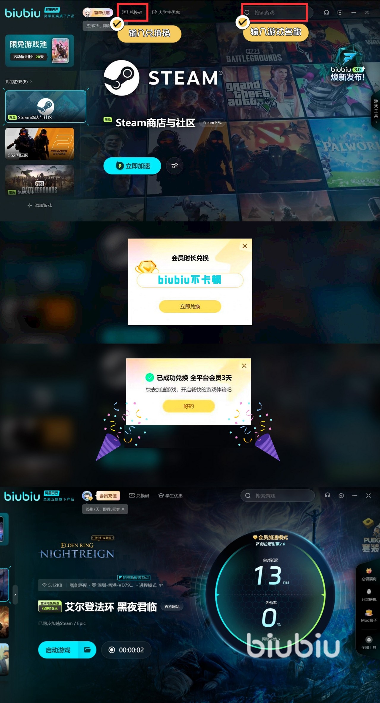 双人石像鬼战对团队配合要求高,推荐3人联机分摊压力,同时需借助biubiu加速器稳定联机环境,实时多路发包技术可降低数据丢包率,避免因延迟导致救援失败或技能空放。现在新用户注册即享24小时免费加速时长。输入【biubiu不卡顿】的兑换码,新老用户们再领72小时福利时长,助力开黑极限配合。