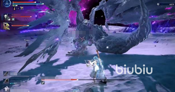 在战斗的时候,大家的武器可以带有附加中毒和冻伤异常状态,他的第一阶段攻击能力比较弱,张开大嘴就会吞噬,这个时候玩家需要从左右两边翻滚躲避。