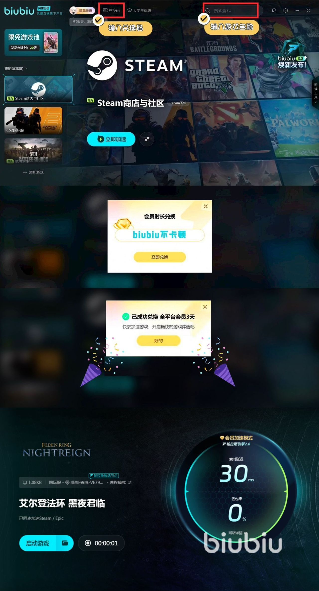 玩这款游戏的时候不妨搭配这款加速工具,遍布全球的服务器节点,能够根据大家所在地区自动匹配最优线路,显著降低延迟和丢包率。安装注册后新用户享有24h专属优化体验。同时新老用户,也可通过输入专属口令【biubiu不卡顿】,兑换三天的优化时间,玩该游戏的伙伴们只要是你在5月30日-6月13日,这个时间段登录该优化平台台,就可以享受全天的限时加速时长,跟好友享受联机不掉线体验。