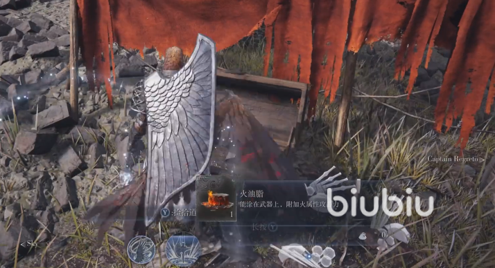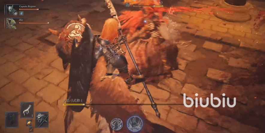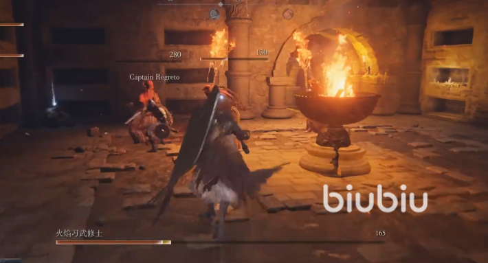 火焰习武修士这个小精英怪在废墟地下层,需要从废墟绕下去,有一个拱形门入口。它结合了高额火焰伤害、霸体机制和多变攻击模式。门口有一些攻击较低的小怪,清理的时候会掉落火油脂,可以增加火属性攻击力。还有冻伤苔药,可以抵消自身冻伤积累。