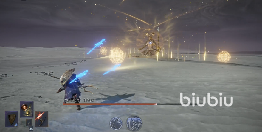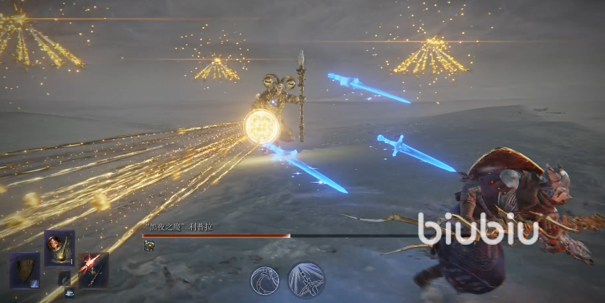 核心招式【黄金法阵】会在地面生成持续发狂区域,需紧盯其施法动作,法阵成型前立即横向闪避。跟踪魔法弹幕可通过灵活走位规避,闪避后可短暂反击。