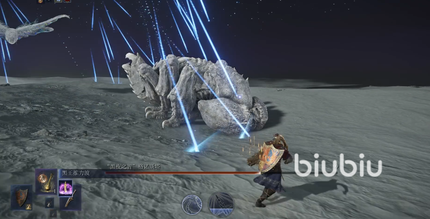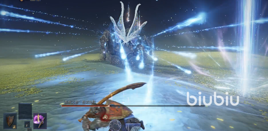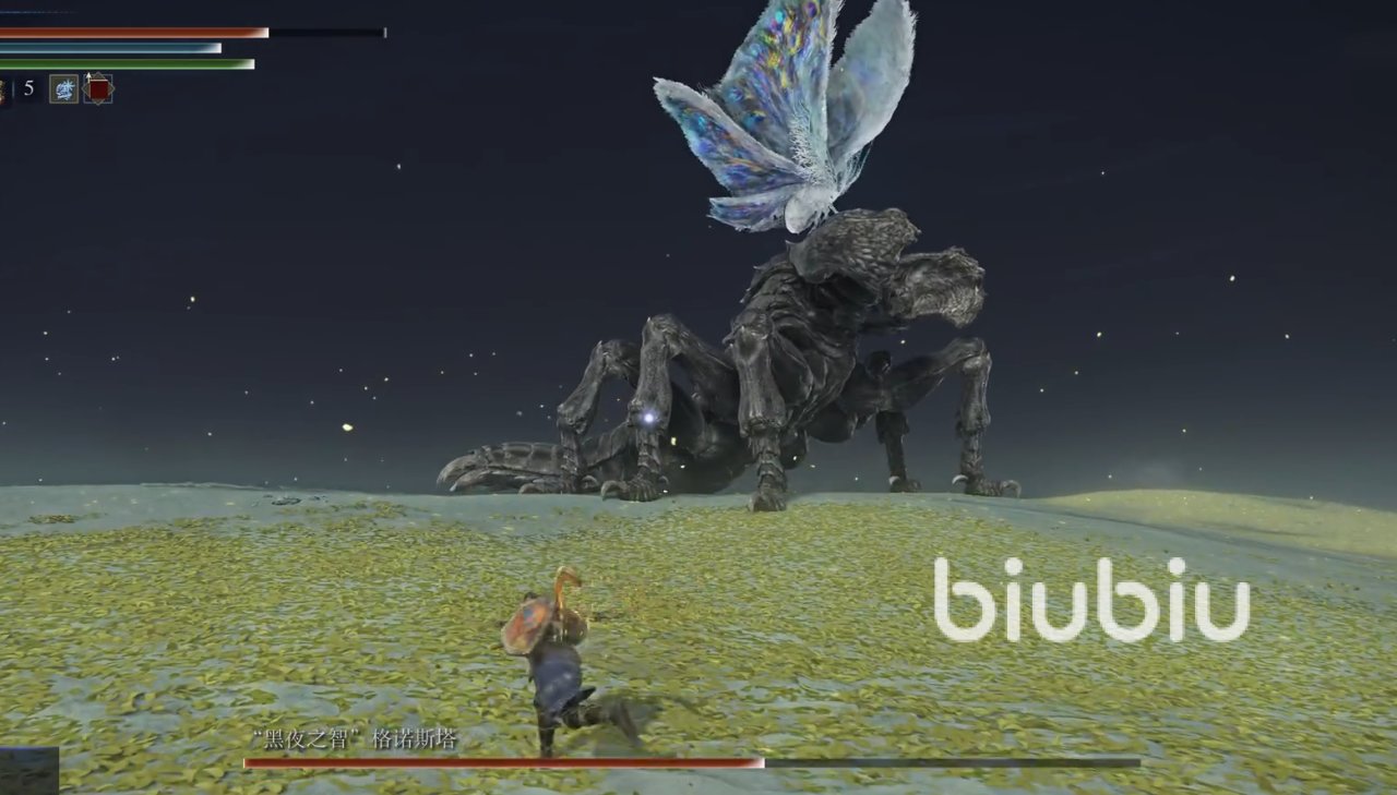 第二阶段飞蛾与蝎蟹形生物合体,攻击模式融合为组合技,其强化版魔法飞弹前摇明显,本体泛白时会召唤多道跟踪光束,需持续奔跑规避,最后一段光束附带多段致命伤害。之后会有一段时间的硬直,抓紧时机输出,近战 也可以快速翻滚至腹部下方进行输出。