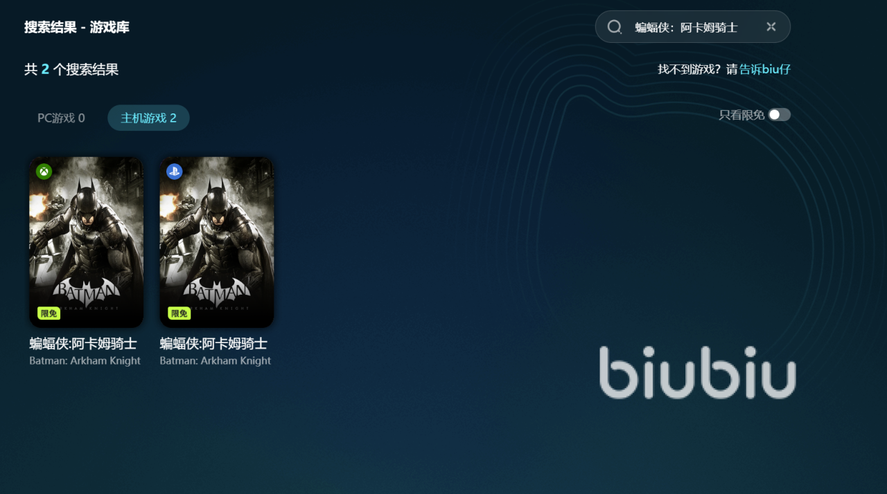 新用户注册可以直接领取平台赠送的24h加速时间,所有用户都可以用【biubiu不卡顿】兑换3天的免费加速时间。同时该平台还设有限免游戏专区,蝙蝠侠:阿卡姆骑士正是其中之一,支持steam及暴雪平台的免费加速服务,非常适合喜欢这款游戏的用户搭配使用。
