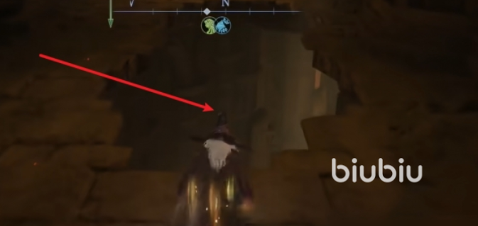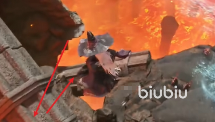 过去之后沿着岩壁往下跳,石头是不规则凸起的,建议各位侧着身位下移才可以找到柱子落脚点。