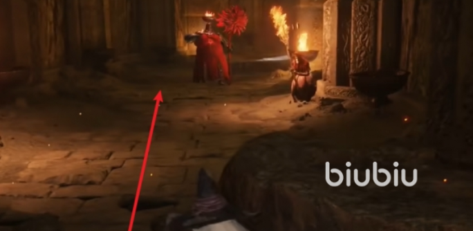 打败怪物之后找到中央的洞口往下跳,来到下方可以看到长廊里面有很多火炬,一直往前走,跳过断桥,又会遇到小怪,打败之后穿过他们后方的门,有像雾气一样特效的是对的。