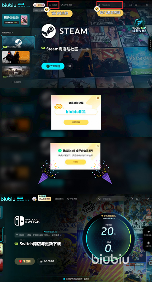 针对Switch2常见的高延迟、掉帧问题,biubiu加速器采用智能路由优化技术,能显著降低Ping值,而且新用户输入这个兑换码——【biubiu001】就能拿到72小时免费加速时间,叠加大家注册的时候免费赠送的24小时,总计96小时的免费加速体验机会非常难得,而且biubiu还针对各位Switch2玩家们开启了全部游戏限时免费加速活动,大家快去感受一下吧!