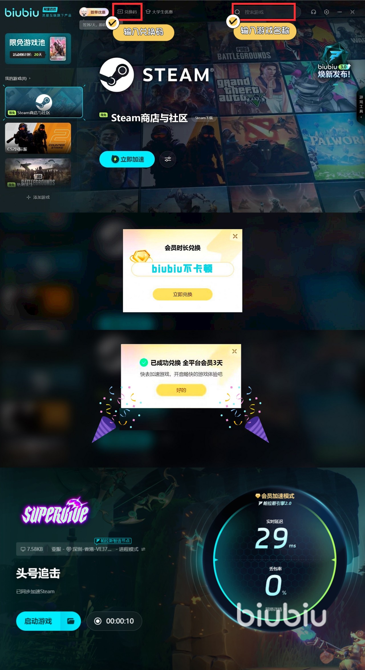 若希望延长加速时间,可前往首页兑换,输入【biubiu不卡顿】,所有平台用户均可额外获得72小时加速机会,对于新用户而言,总计96小时超长加速时间支持,助力各位去长时间畅玩,关机就在于无论是PC、主机还是发售平台等,biubiu均能智能匹配最优网络通道,实时优化延迟与丢包问题,让各位到时每一次对局都很顺畅。