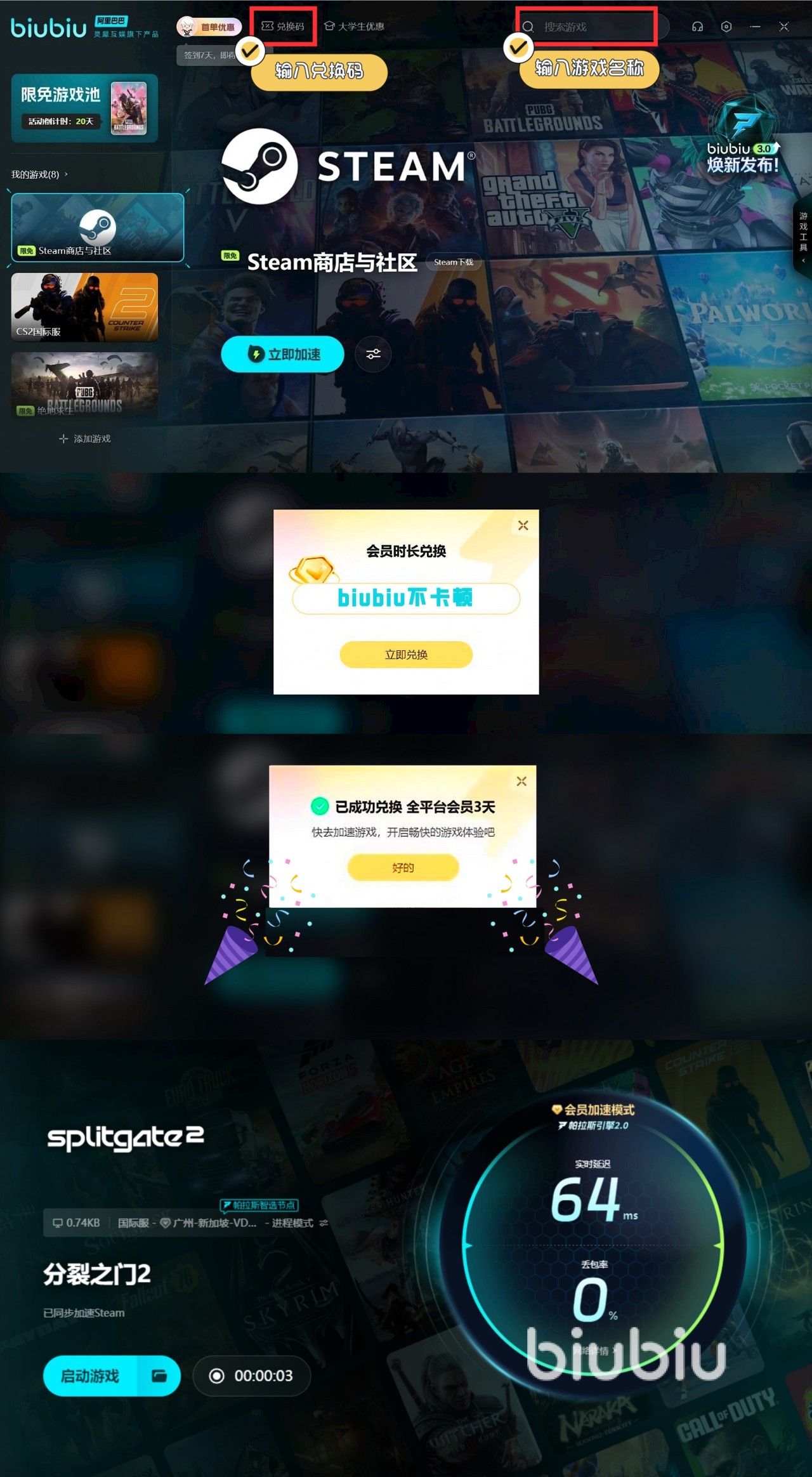 如果各位到时希望能解锁更多加速机会,以次来助力自己长时间体验,而不用担心这个过程中会有掉帧等方面问题影响,那么可考虑点击首页上方兑换,然后输入【biubiu不卡顿】,这样所有平台用户均可顺利领取72h加速时长,让自身去长时间体验,而不用在担心过程中会有掉帧等方面问题发生。