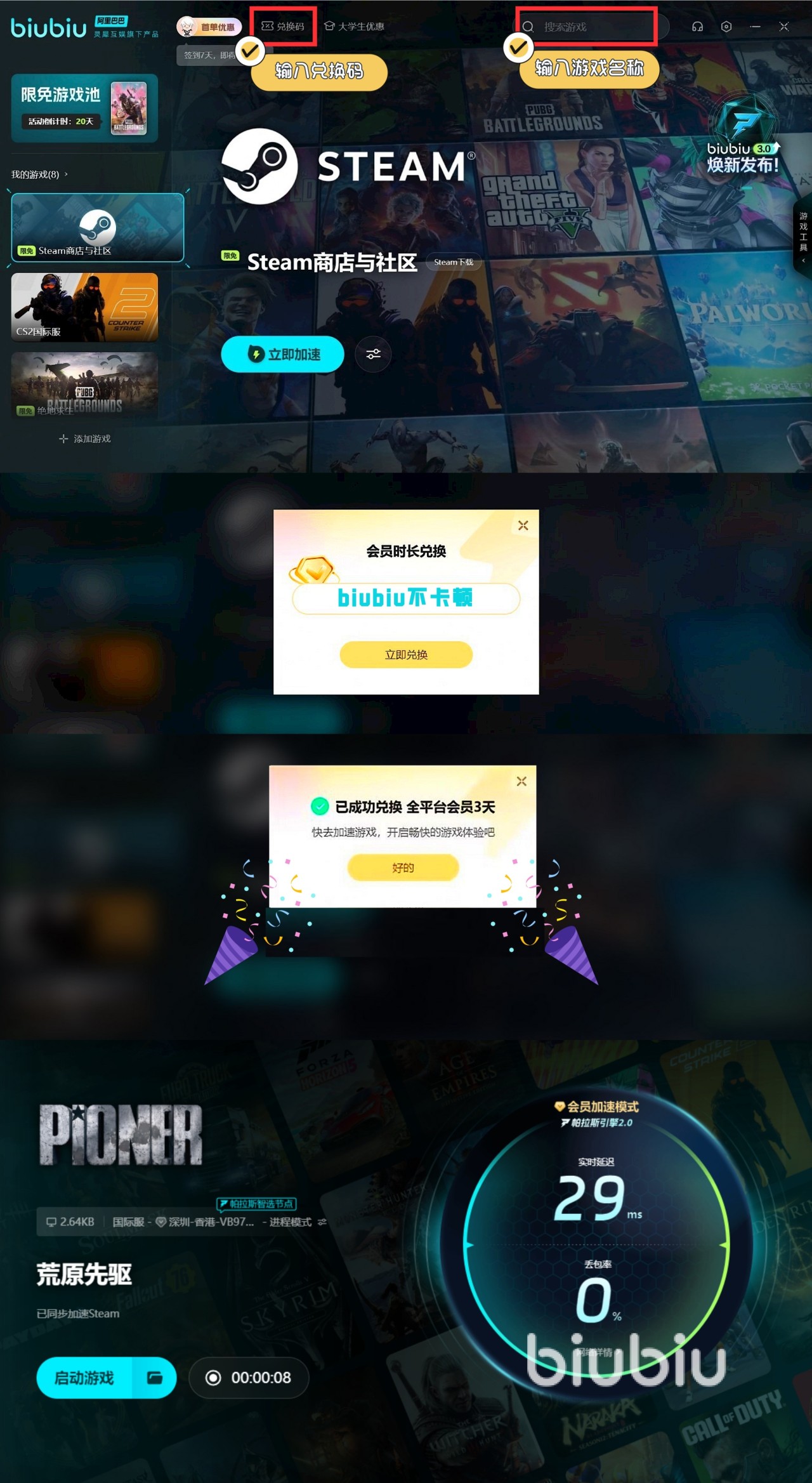 如果想领取更多加速时长,那么可输入【biubiu不卡顿】,这样所有平台用户均可获72小时,而新用户累计可领取到长达96小时超长免费加速。