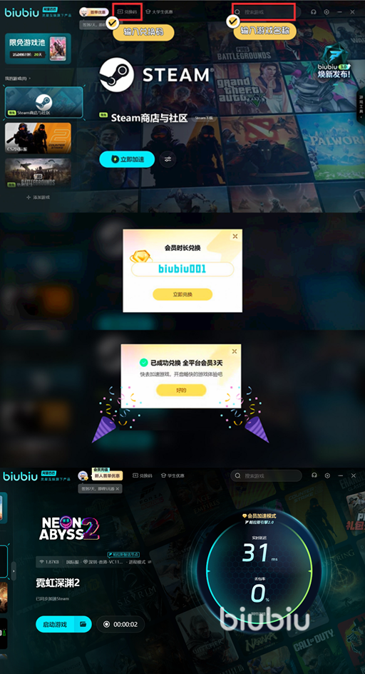 如果你刚刚接触这款工具,不妨先试试它的免费加速服务。注册之后,你可以免费体验24小时的加速效果,输入专属兑换码“biubiu001”还能再得72小时的会员加速时长,这些加速时长足够你把游戏的各种问题彻底解决,新用户总共有96小时时间可以进行免费加速。