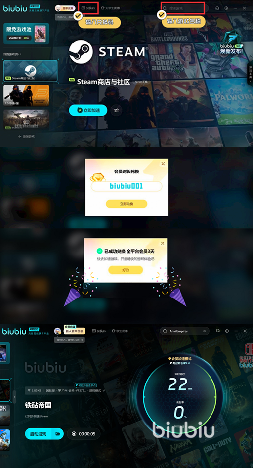 不过作为一款大型的PC游戏,对于网速的流畅度和稳定度要求极高,因此在正式开启战役之前,需要玩家先解锁一款好用的游戏加速器,目前不少游戏大佬,推荐biubiu游游戏加速器,这款游戏加速器,也在进行着相应的福利活动,新人成功注册后,可以免费获得24小时的加速时长,再通过biubiu001这个福利兑换码,可再解锁三天免费加速时长,96小时,让你畅享游戏欢乐。
