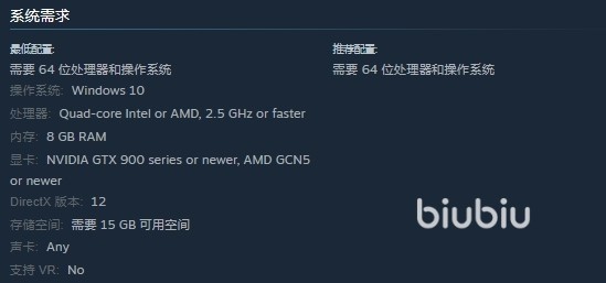 最低操作系统Windows 10 64位版本,处理器配备四核Intel或AMD处理器,主频至少为2.5 GHz,内存8 GB RAM,显卡英伟达GTX 900系列,DirectX 12的支持是必须的,存储15 GB。