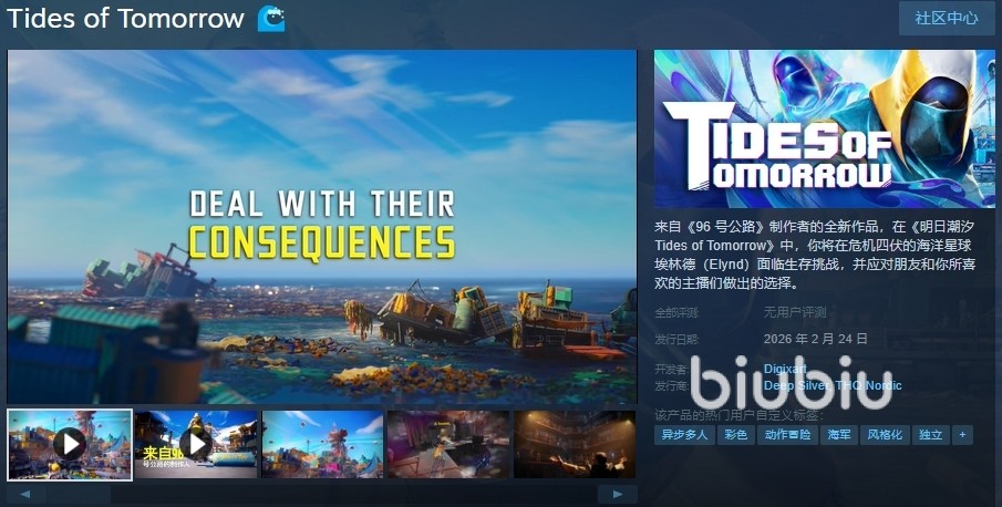 明日潮汐在steam上的名字是Tides of Tomorrow,英文名字也是这个,玩家只需复制搜索即可轻松找到这款游戏。预计于2026年2月24日正式发售,届时将登陆PC Steam、PS5和Xbox Series平台。目前,游戏已经在steam上发布,并且提供了中文版本,全球玩家都可以沉浸在这个充满未知与挑战的海洋世界中。