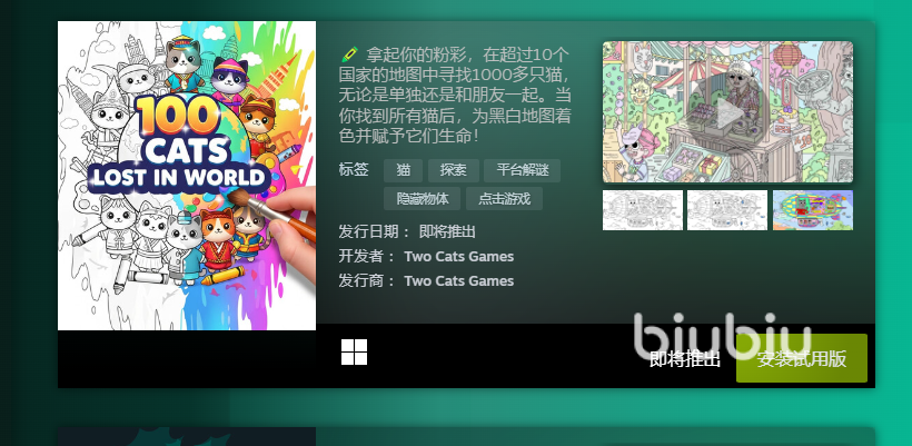 100 Cats Lost In World Find & Color:绘画跟找不同结合在一起的游戏,提供了10个国家的地图给玩家寻找超过1000只可爱猫猫,找到之后就能涂色,赋予猫咪更鲜活的生命力吧。