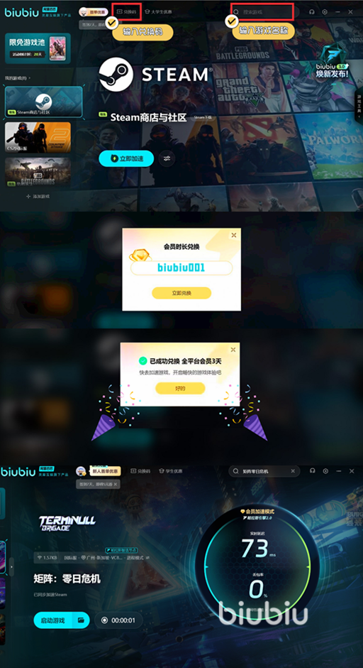 在biubiu加速器中,新用户踏入矩阵:零日危机的赛博世界,即刻享有24 小时专属特权体验!在这珍贵的 24 小时里,能自由体验六大特色角色的独特魅力,当24小时新用户体验结束,兑换码【biubiu001】将为大家解锁72小时的豪华福利时光,将新用户24小时特权与兑换码72小时福利无缝衔接,便能畅享整整96小时的超长游戏狂欢,从根据不同地图风格调整战斗策略,到与队友协作解锁新的战术体系,每一秒都充满惊喜与挑战。