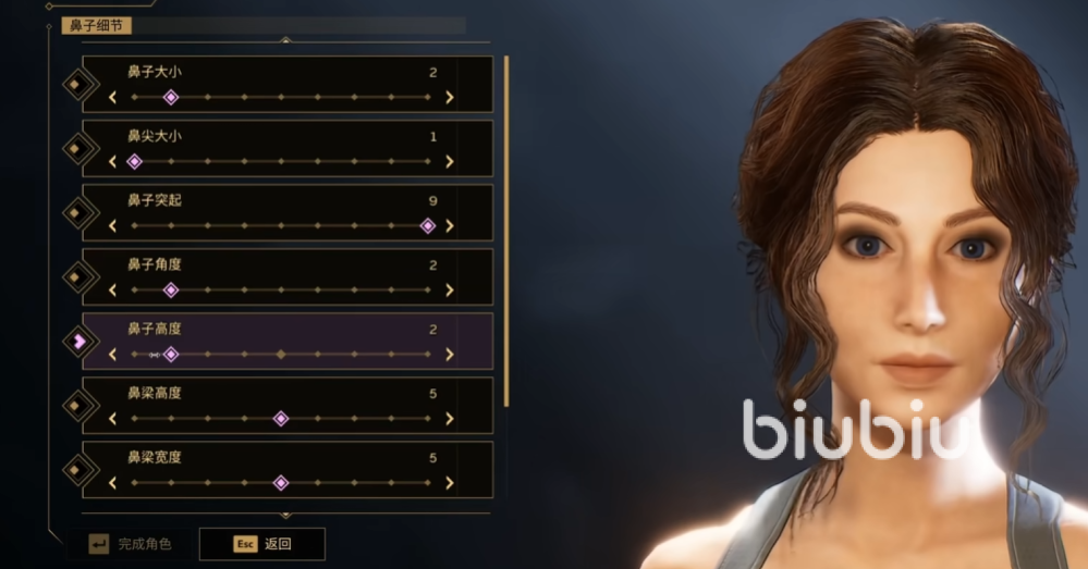眼睛需要拉大一点,调整到7即可,预设鼻子太大,我们将大小调整到2,鼻尖调到1,然后角度跟高度都设置成2,鼻梁跟宽度设置到5,就得到英挺好看的鼻子了,发型以及发色按照自己喜好去调整。